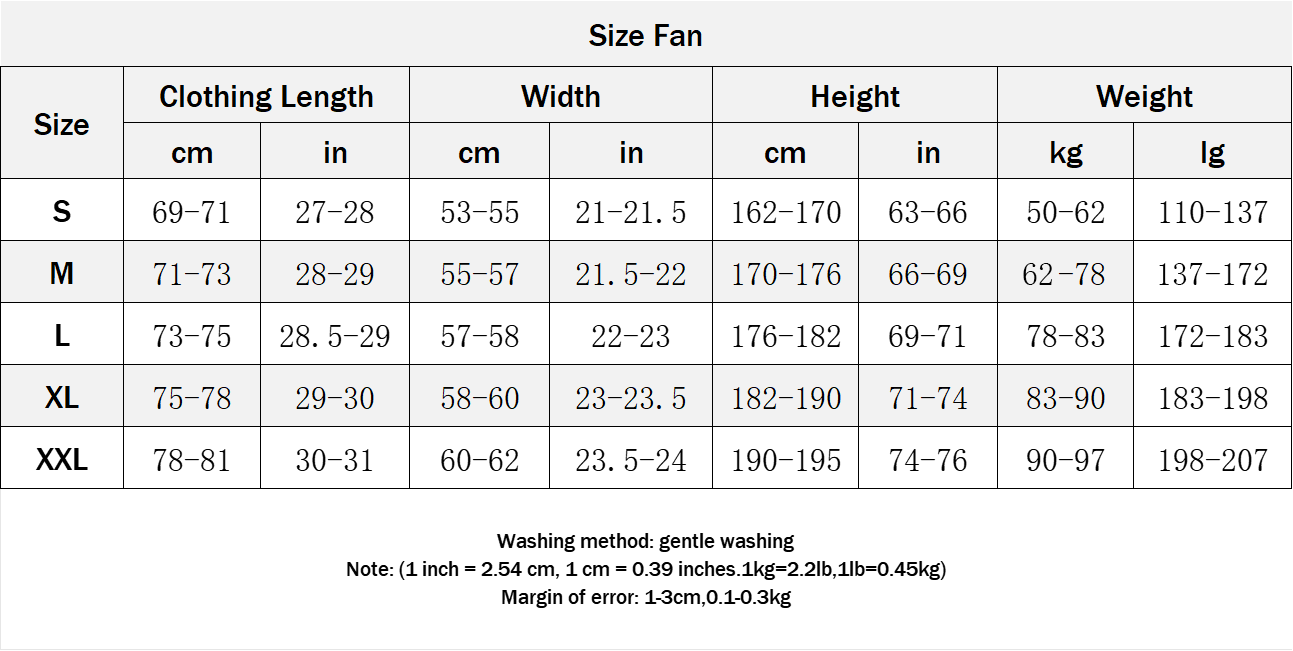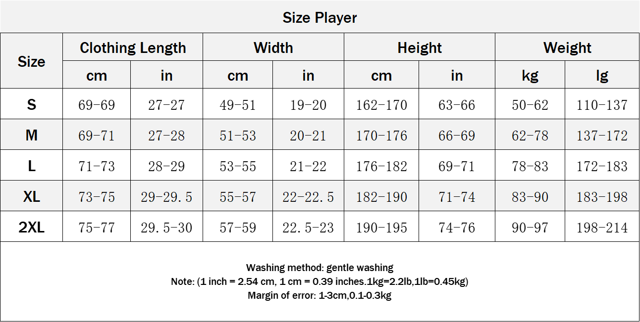 Please note that all the sizes are measured in inches. Please note that due to measurement errors, there may be a 2-3inch discrepancy between the actual jersey size and the size chart, which is considered normal. If your measurements fall between two sizes or if you are overweight or have a muscular build, we highly recommend purchasing a larger size to ensure a more comfortable fit and better wearing experience.