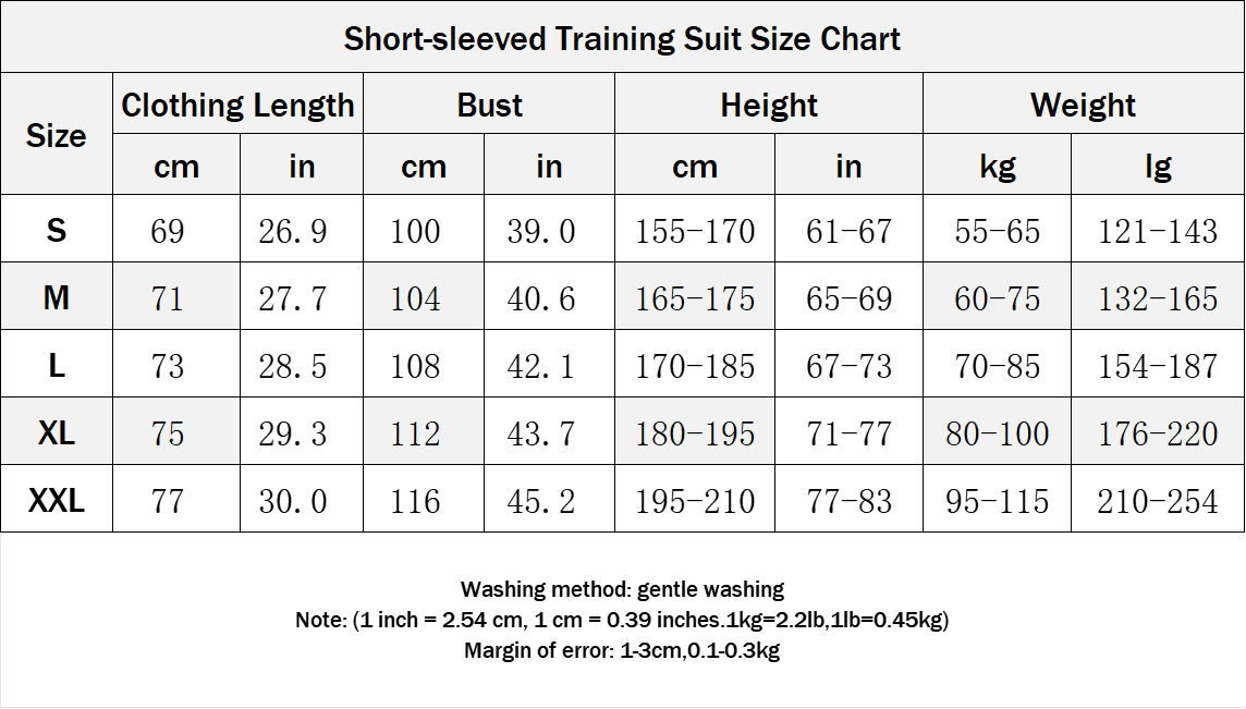◾Short-sleeved Training Suit Size Chart ◾Shorts Size